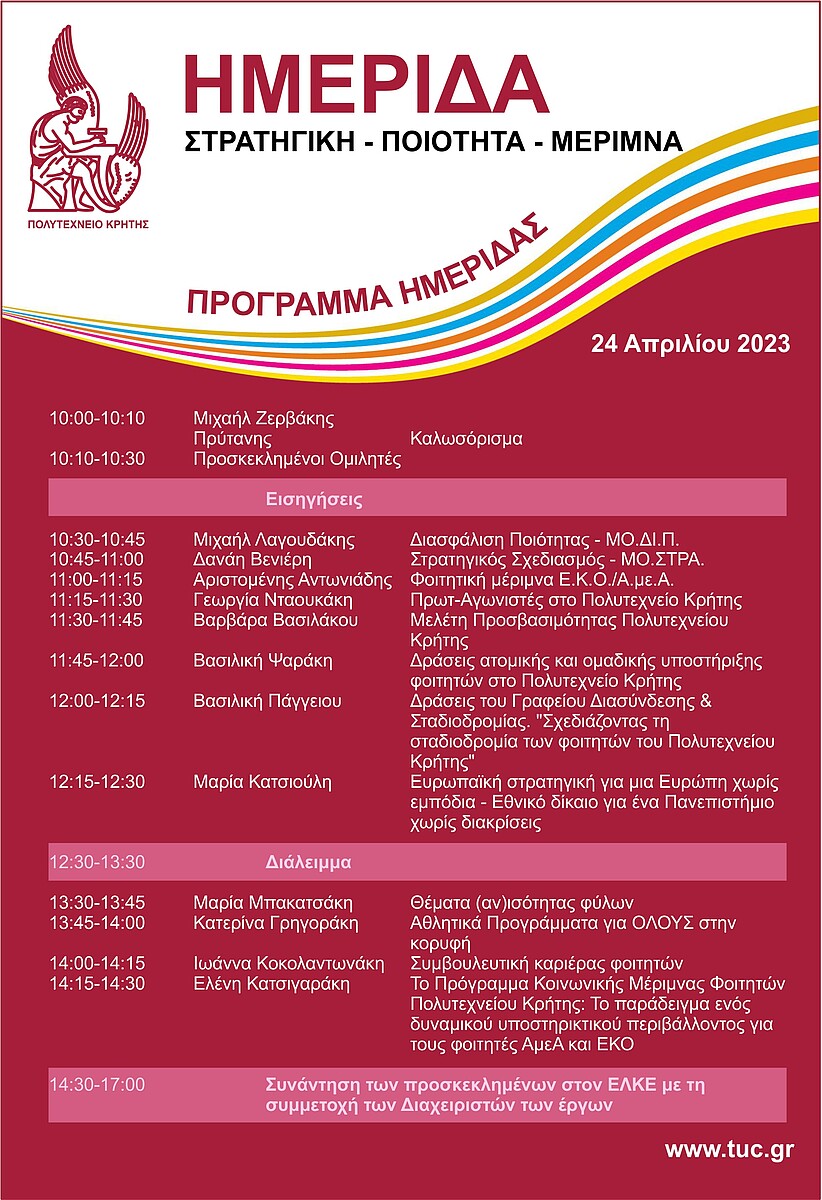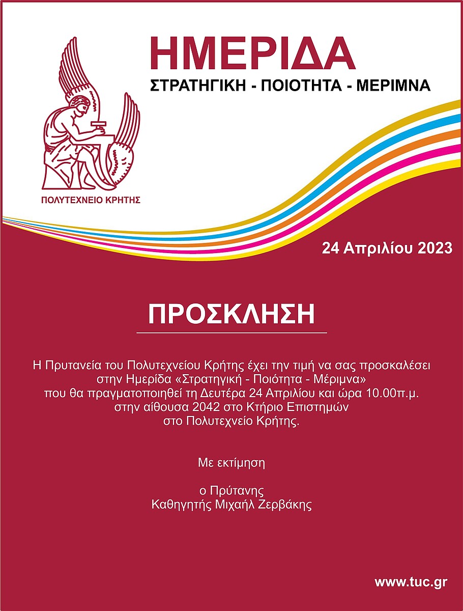 Η Πρυτανεία του Πολυτεχνείου Κρήτης σας προσκαλεί στην Ημερίδα «Στρατηγική – Ποιότητα – Μέριμνα» που διοργανώνεται στο πλαίσιο του Επιχειρησιακού Προγράμματος "Ανάπτυξη Ανθρωπίνου Δυναμικού, Εκπαίδευση και Δια Βίου Μάθηση" (ΕΣΠΑ 2014-2020) και θα πραγματοποιηθεί τη Δευτέρα 24 Απριλίου 2023 και ώρα 10:00 στην αίθουσα 2042 στο Κτήριο Επιστημών στην Πολυτεχνειούπολη.